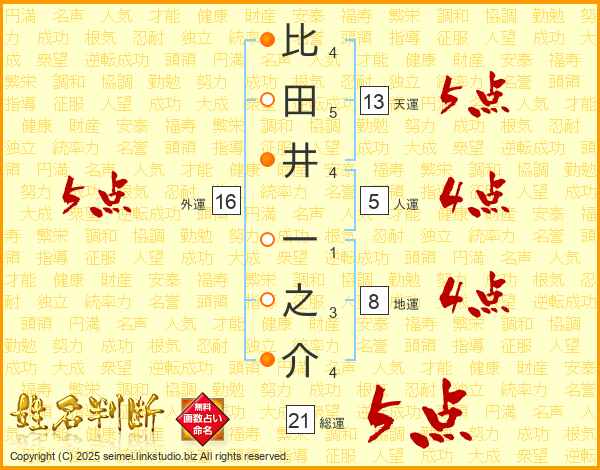 比田井一之介さんの総運は21画の5点!