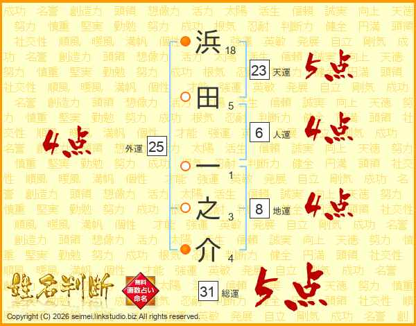 浜(18画)田(5画) 一(1画)之(3画)介(4画)