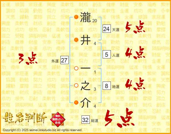 瀧(20画)井(4画) 一(1画)之(3画)介(4画)