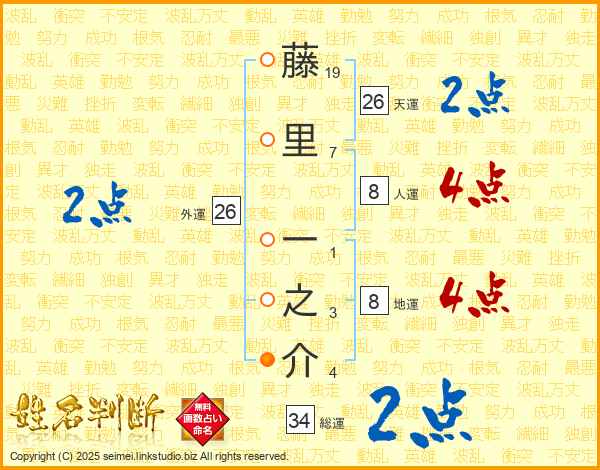 藤(19画)里(7画) 一(1画)之(3画)介(4画)