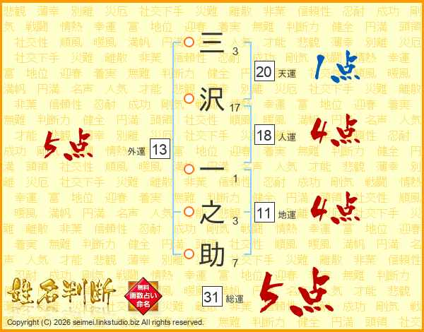 生活面を象徴する運勢です。外部から受ける影響力を表し、結婚運、家庭運や職場、環境への順応性を表します。総運から人運を引いた画数。姓や名が1文字の場合を除く。