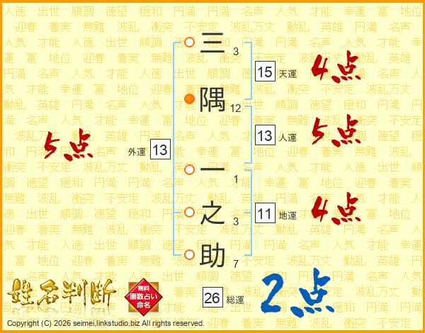 生活面を象徴する運勢です。外部から受ける影響力を表し、結婚運、家庭運や職場、環境への順応性を表します。総運から人運を引いた画数。姓や名が1文字の場合を除く。
