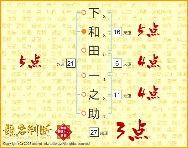 下(3画)和(8画)田(5画) 一(1画)之(3画)助(7画)