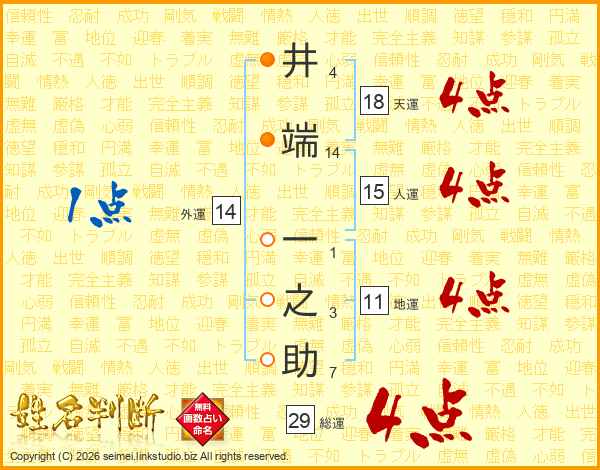 井(4画)端(14画) 一(1画)之(3画)助(7画)