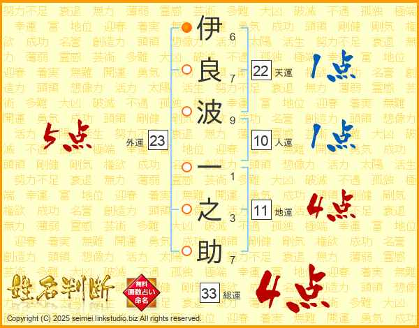 伊(6画)良(7画)波(9画) 一(1画)之(3画)助(7画)