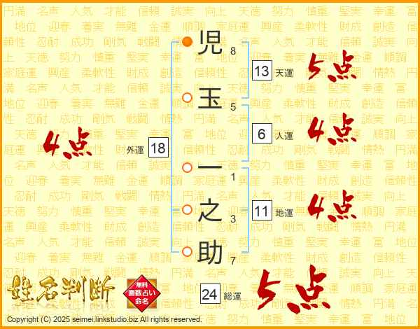 児(8画)玉(5画) 一(1画)之(3画)助(7画)