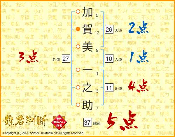 加(5画)賀(12画)美(9画) 一(1画)之(3画)助(7画)
