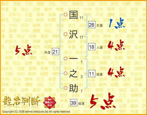 国(11画)沢(17画) 一(1画)之(3画)助(7画)