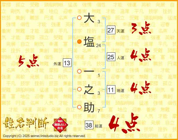 大(3画)塩(24画) 一(1画)之(3画)助(7画)