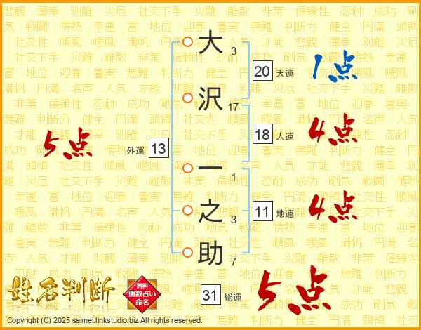 大沢一之助さんの総運は31画の5点!