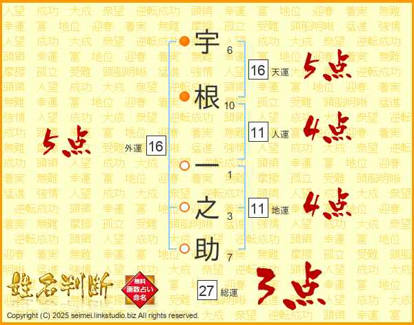 宇(6画)根(10画) 一(1画)之(3画)助(7画)