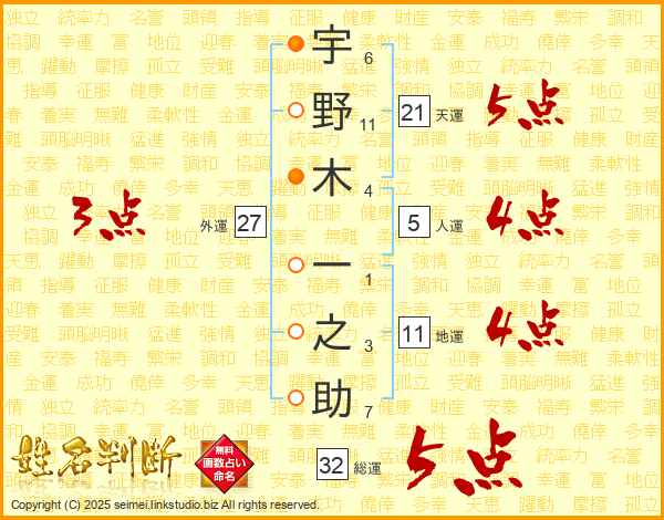 宇(6画)野(11画)木(4画) 一(1画)之(3画)助(7画)