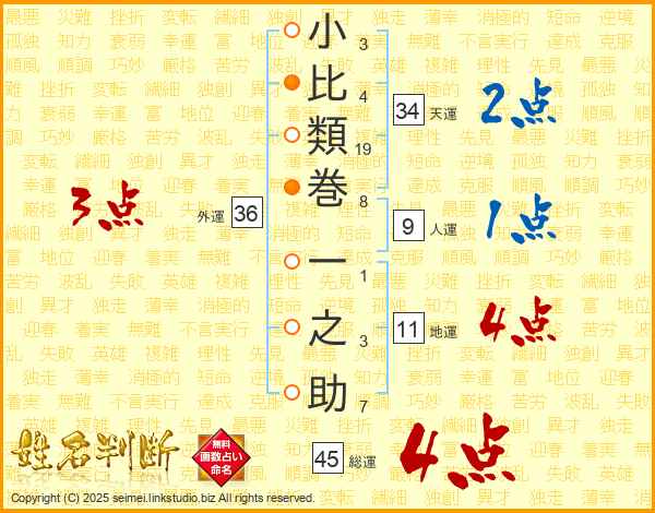小(3画)比(4画)類(19画)巻(8画) 一(1画)之(3画)助(7画)