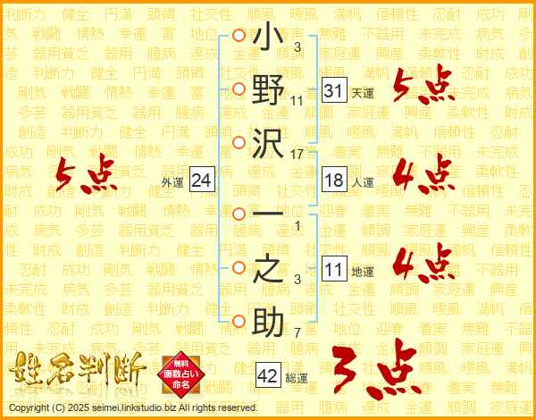 小野沢一之助さんの外運は24画の5点!
