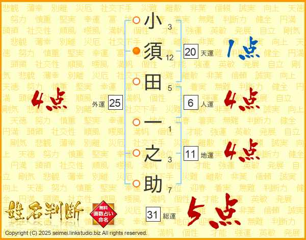 小(3画)須(12画)田(5画) 一(1画)之(3画)助(7画)