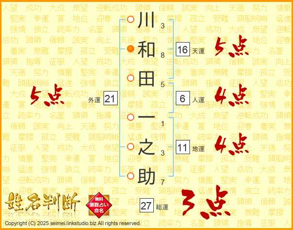 川(3画)和(8画)田(5画) 一(1画)之(3画)助(7画)