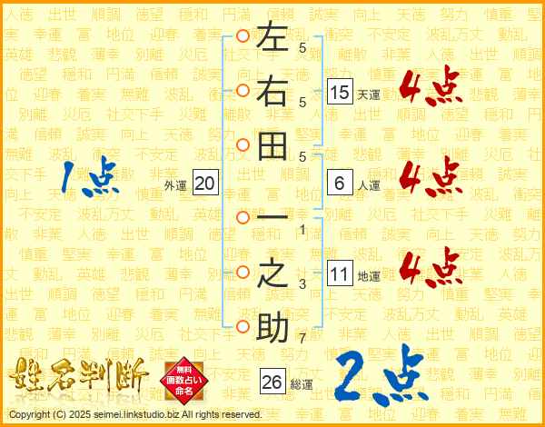 左(5画)右(5画)田(5画) 一(1画)之(3画)助(7画)