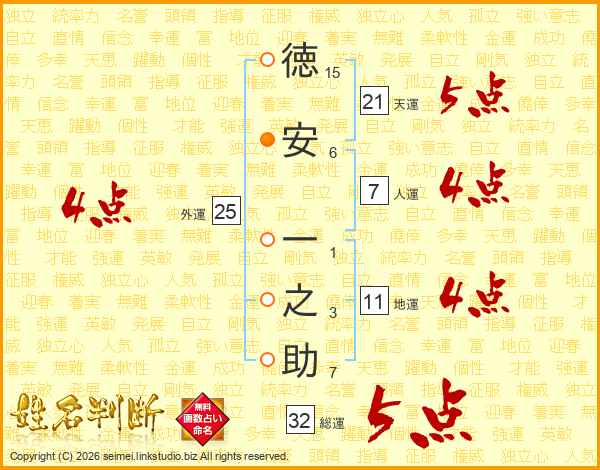 徳(15画)安(6画) 一(1画)之(3画)助(7画)