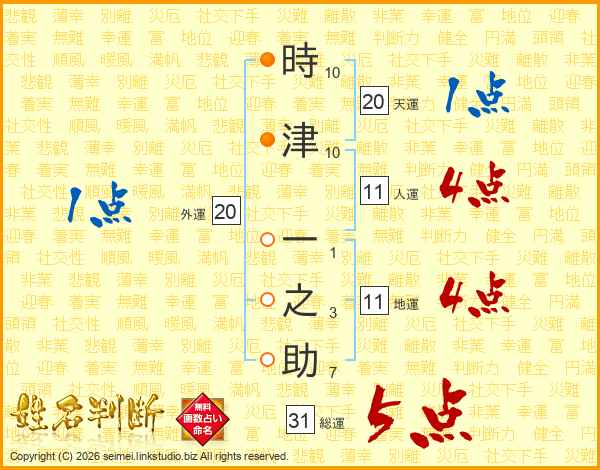時(10画)津(10画) 一(1画)之(3画)助(7画)