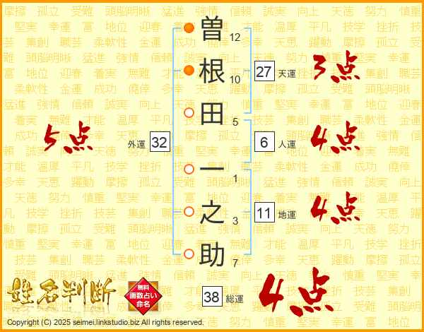 曽(12画)根(10画)田(5画) 一(1画)之(3画)助(7画)