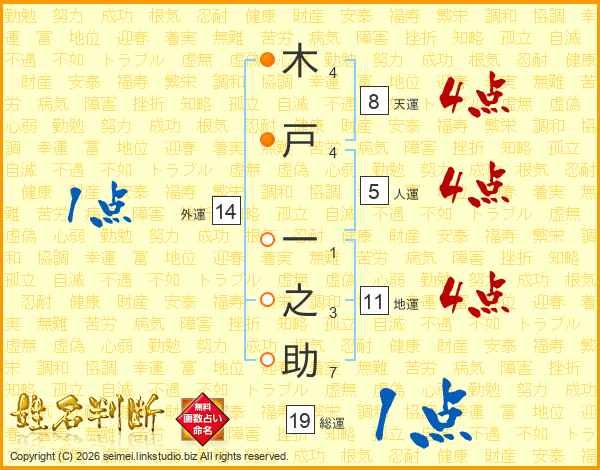 木(4画)戸(4画) 一(1画)之(3画)助(7画)
