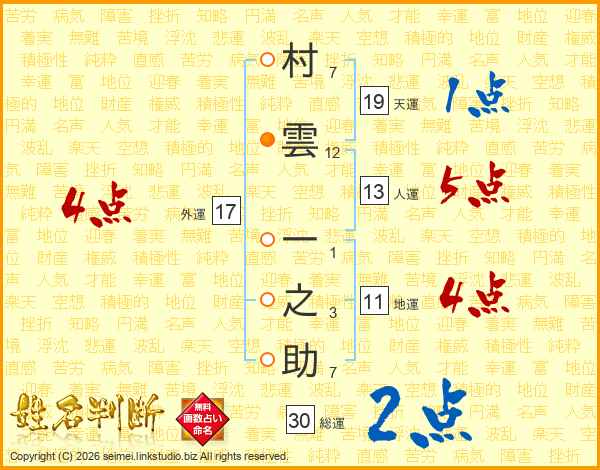 村(7画)雲(12画) 一(1画)之(3画)助(7画)