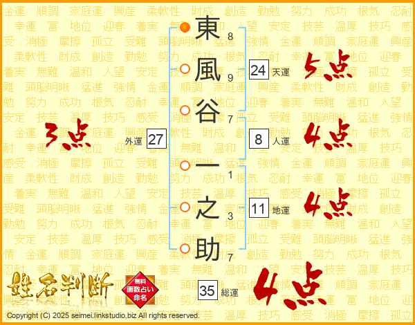 東(8画)風(9画)谷(7画) 一(1画)之(3画)助(7画)