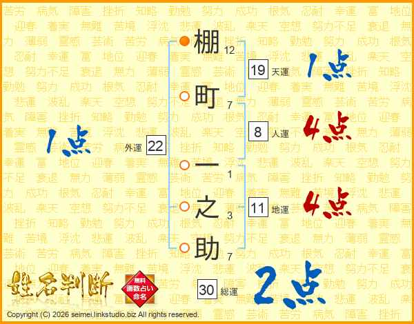 棚(12画)町(7画) 一(1画)之(3画)助(7画)