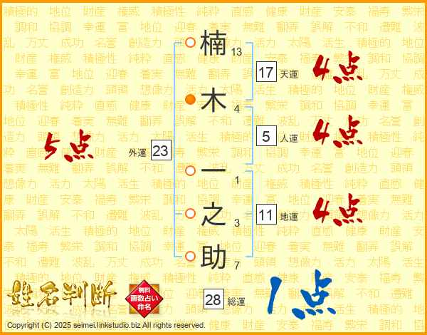 楠(13画)木(4画) 一(1画)之(3画)助(7画)
