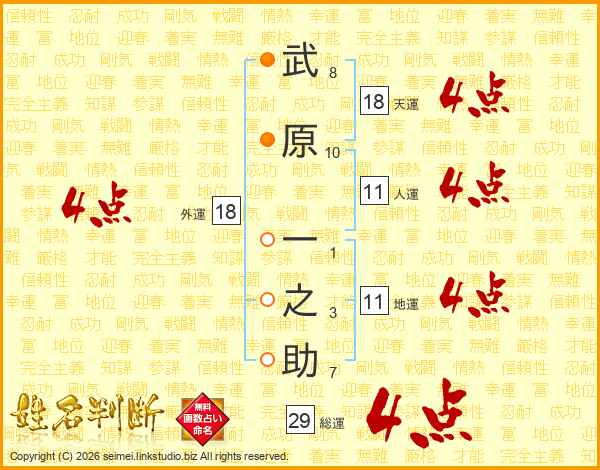 武(8画)原(10画) 一(1画)之(3画)助(7画)