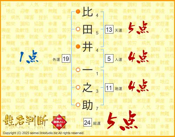 比(4画)田(5画)井(4画) 一(1画)之(3画)助(7画)