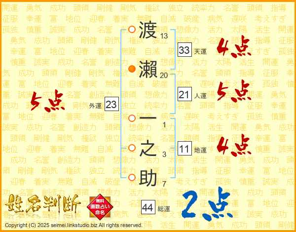 渡(13画)瀨(20画) 一(1画)之(3画)助(7画)