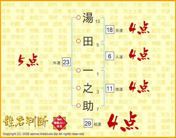 湯(13画)田(5画) 一(1画)之(3画)助(7画)
