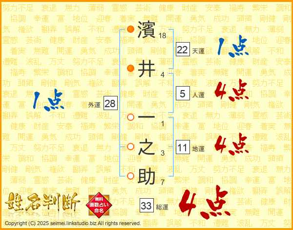 濱(18画)井(4画) 一(1画)之(3画)助(7画)