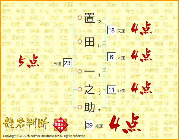 置(13画)田(5画) 一(1画)之(3画)助(7画)