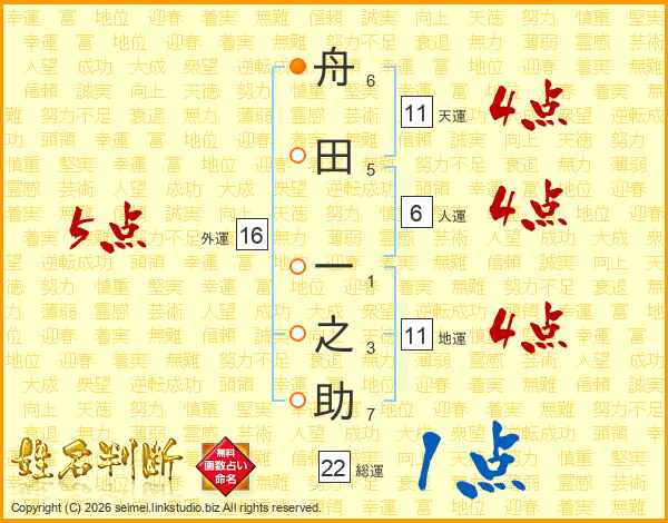 舟(6画)田(5画) 一(1画)之(3画)助(7画)