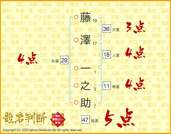 藤(19画)澤(17画) 一(1画)之(3画)助(7画)