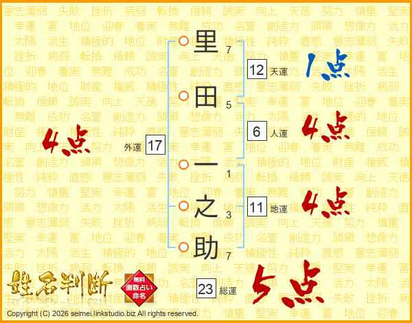 里(7画)田(5画) 一(1画)之(3画)助(7画)