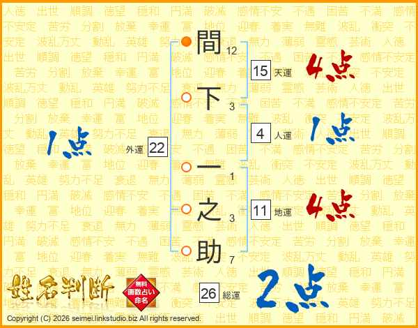 間(12画)下(3画) 一(1画)之(3画)助(7画)