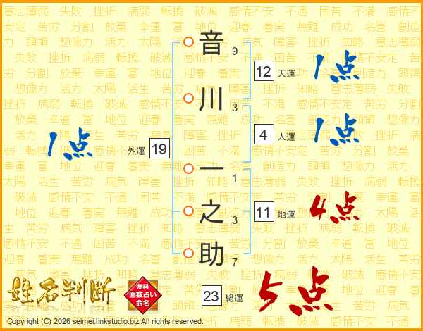 音川一之助さんの総運は23画の5点!