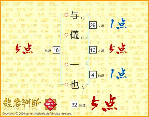与儀一也さんの総運は32画の5点!