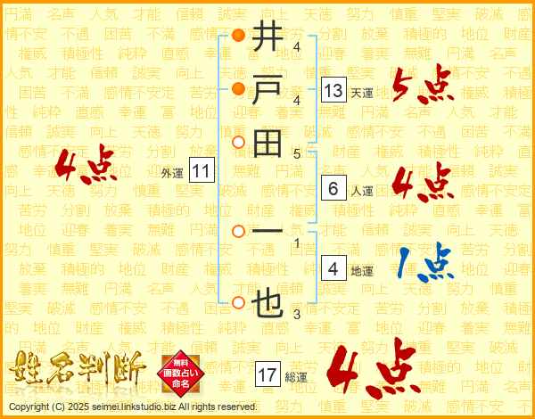 井(4画)戸(4画)田(5画) 一(1画)也(3画)