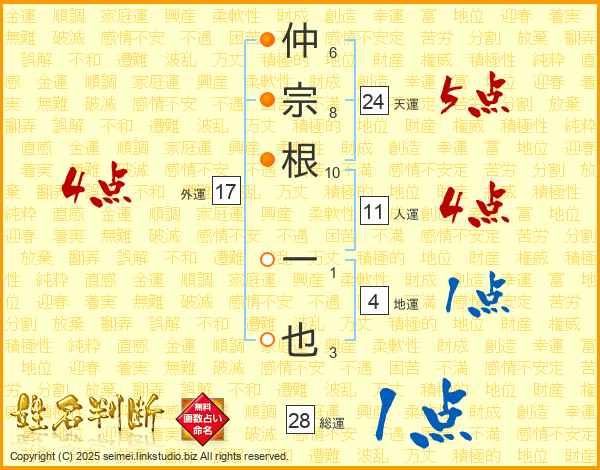 仲(6画)宗(8画)根(10画) 一(1画)也(3画)