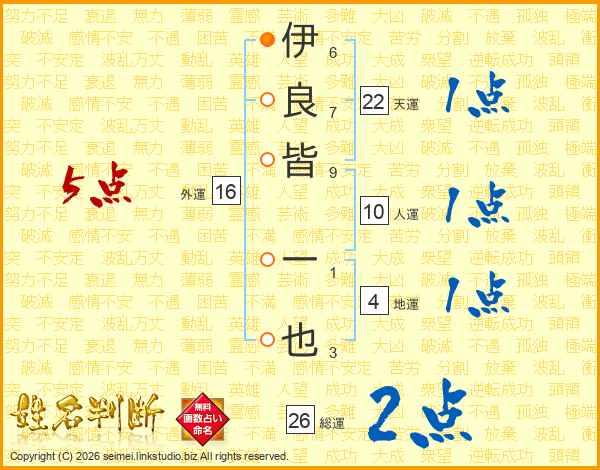 伊良皆一也さんの総運は26画の2点!