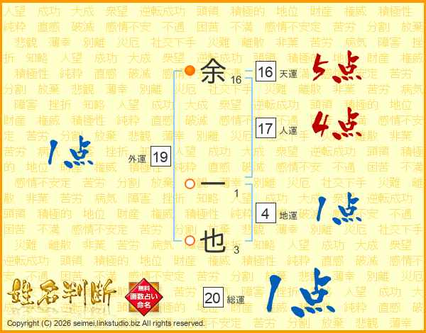 余一也さんの総運は20画の1点!