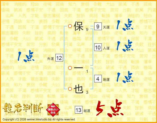 生活面を象徴する運勢です。外部から受ける影響力を表し、結婚運、家庭運や職場、環境への順応性を表します。総運から人運を引いた画数。姓や名が1文字の場合を除く。