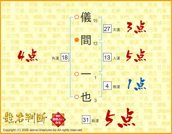 儀間一也さんの総運は31画の5点!