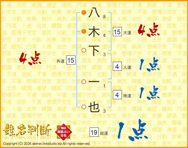 八(8画)木(4画)下(3画) 一(1画)也(3画)