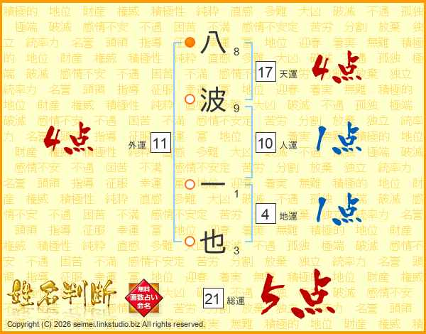 生活面を象徴する運勢です。外部から受ける影響力を表し、結婚運、家庭運や職場、環境への順応性を表します。総運から人運を引いた画数。姓や名が1文字の場合を除く。