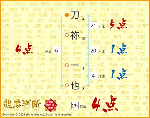 生活面を象徴する運勢です。外部から受ける影響力を表し、結婚運、家庭運や職場、環境への順応性を表します。総運から人運を引いた画数。姓や名が1文字の場合を除く。